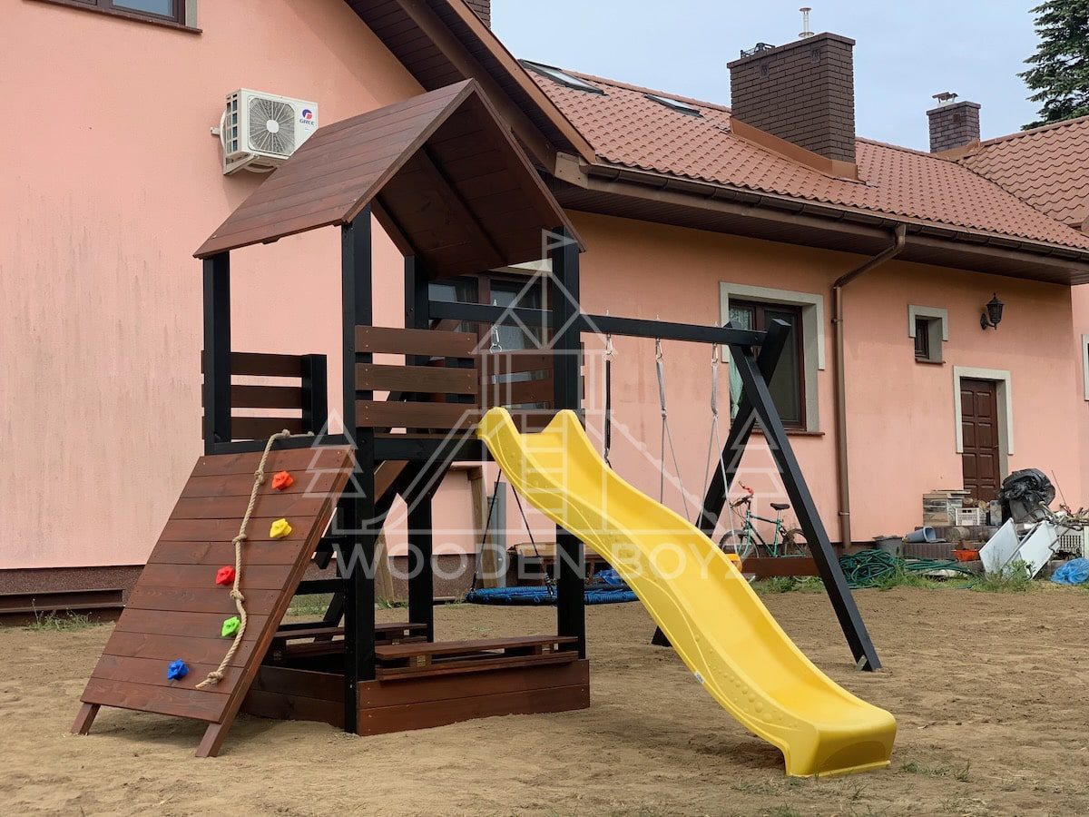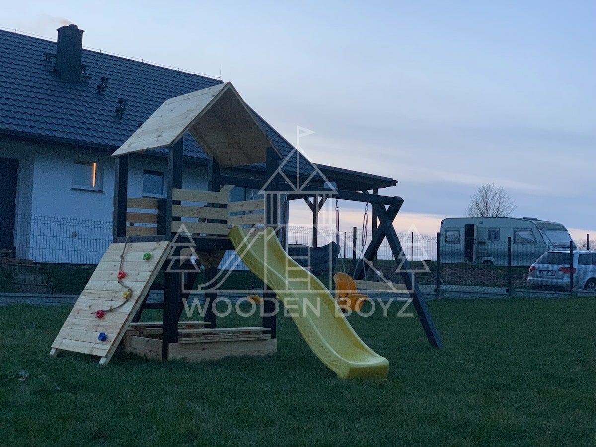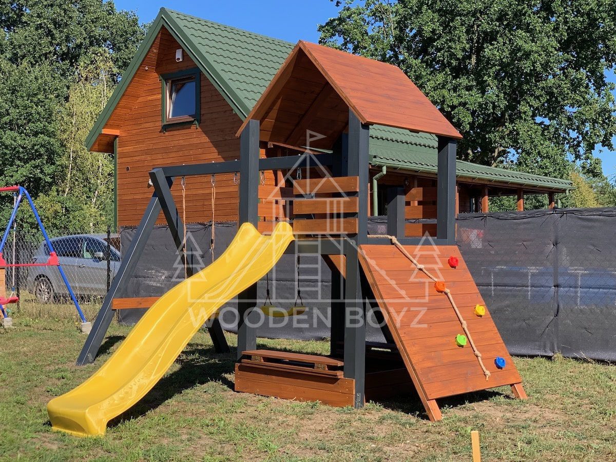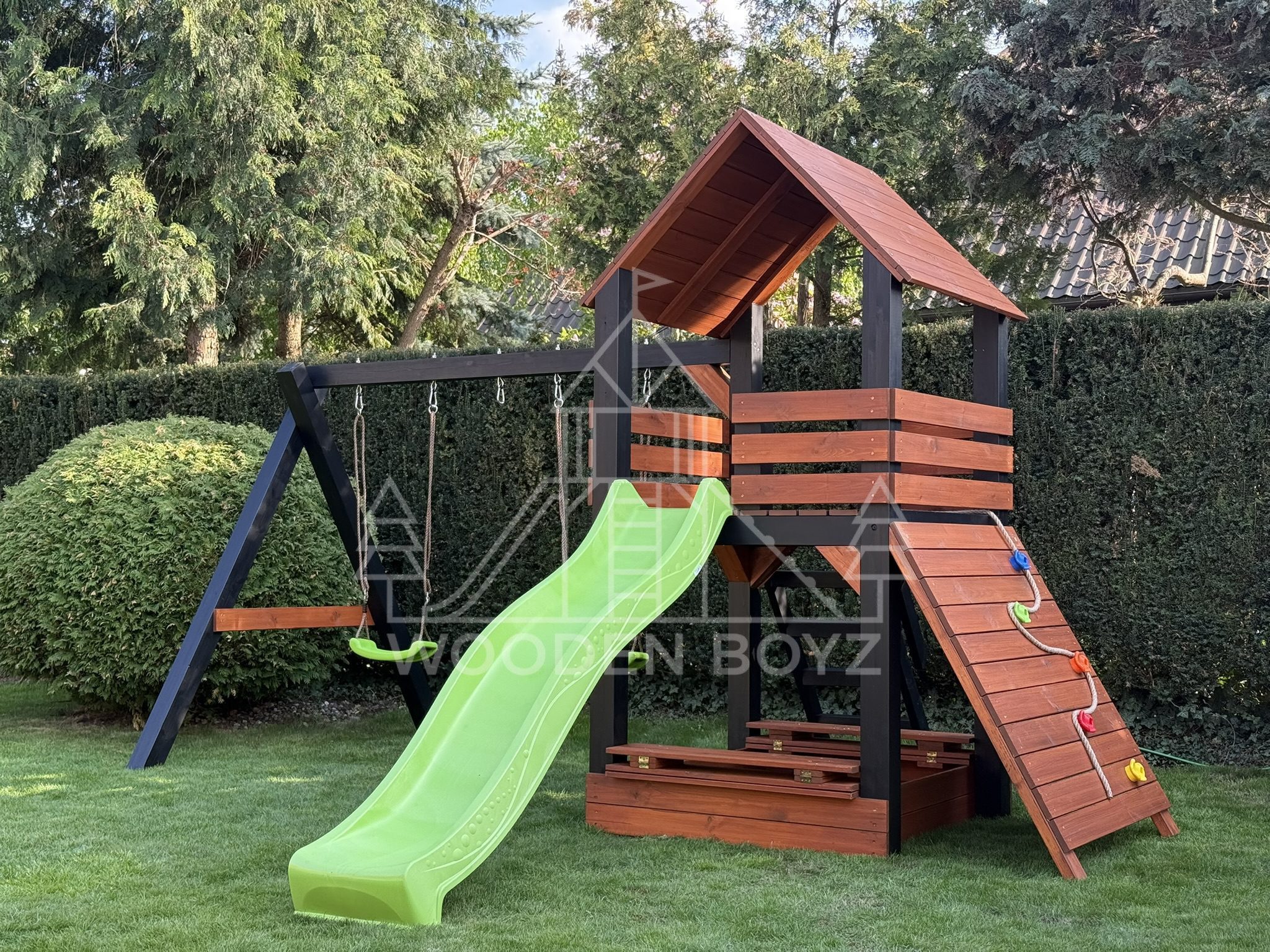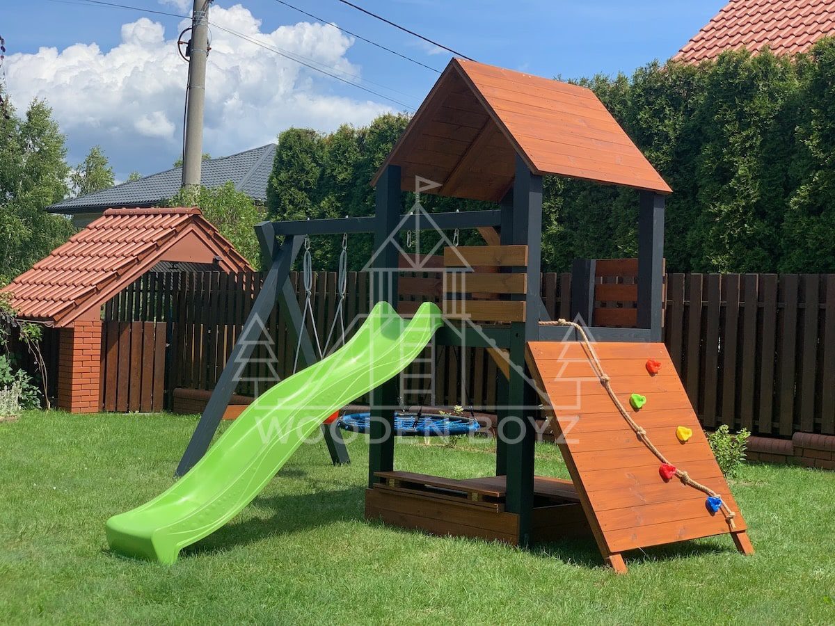 | Wyposażenie standardowe | Otwarta piaskownica Wieża ze ścianką wspinaczkową – dwie możliwości wejścia: po linie i po uchwytach wspinaczkowych Schody Dwie huśtawki – do wyboru kubełek dla najmłodszych lub plastikowa deseczka Zjeżdżalnia o długości 2,5m z możliwością podłączenia wody Impregnaty i akcesoria – szeroka paleta kolorów do wyboru |