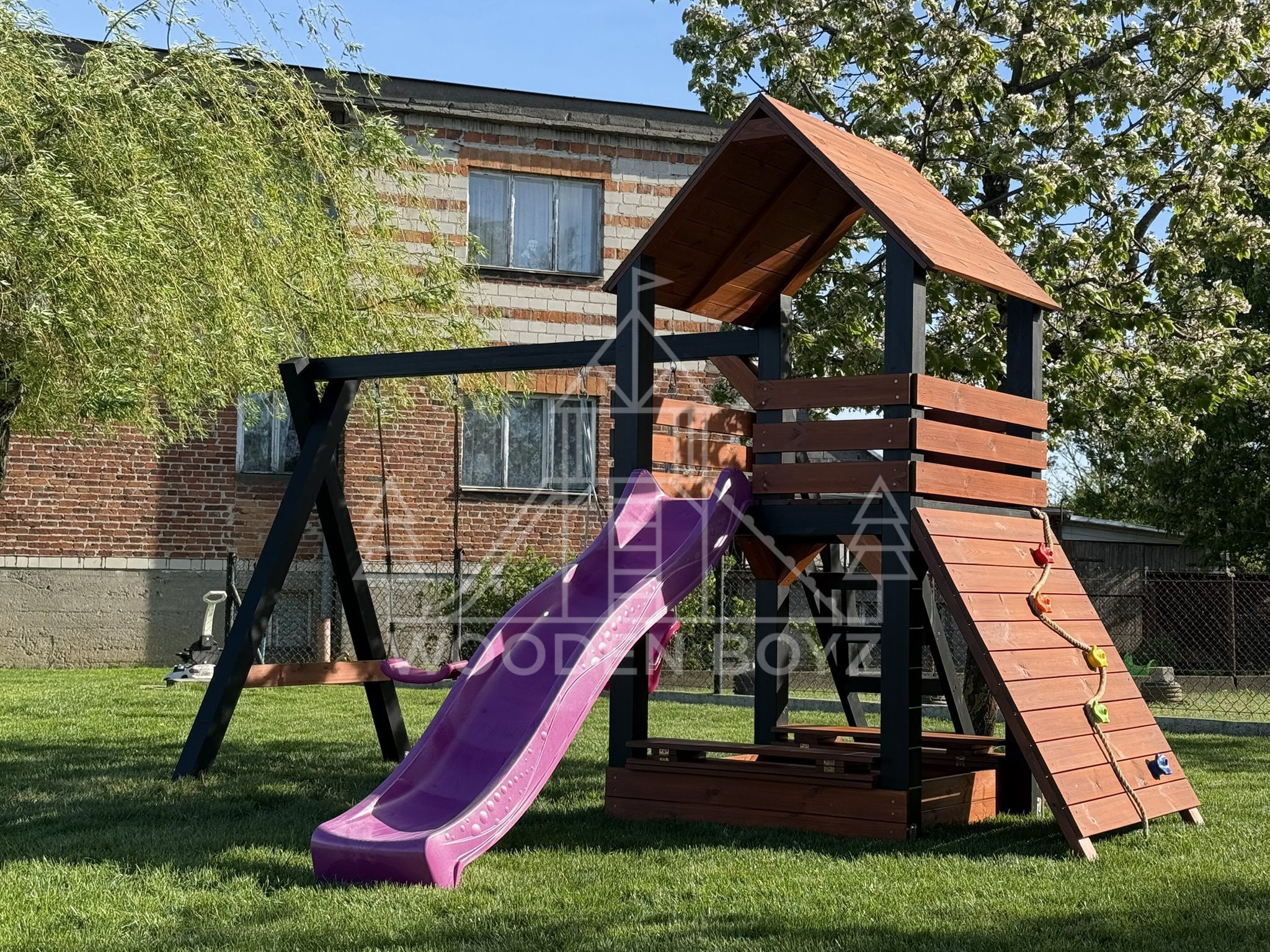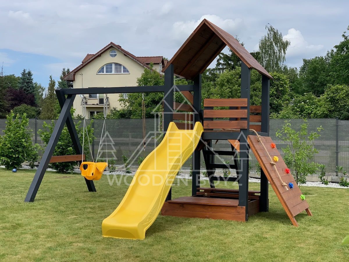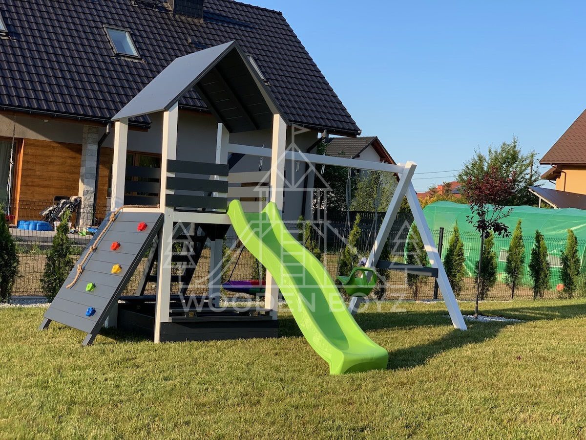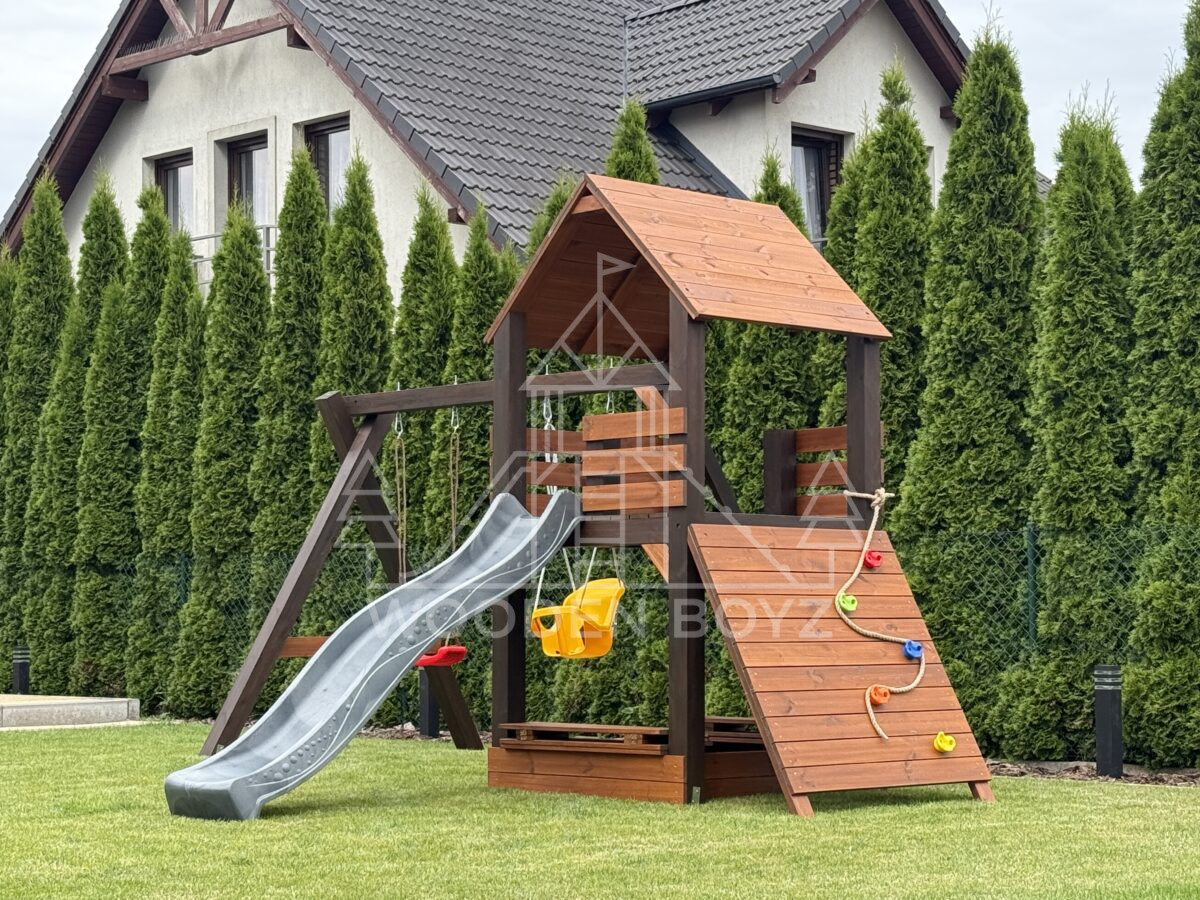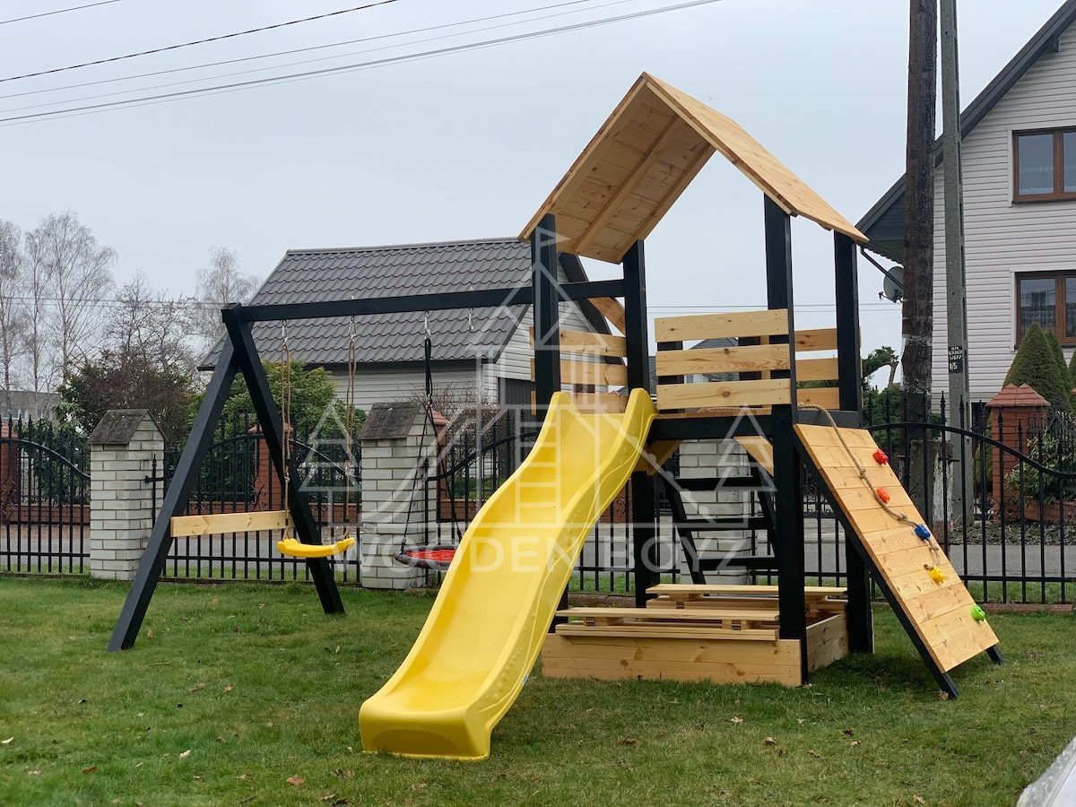 | Wyposażenie standardowe | Otwarta piaskownica Wieża ze ścianką wspinaczkową – dwie możliwości wejścia: po linie i po uchwytach wspinaczkowych Schody Dwie huśtawki – do wyboru kubełek dla najmłodszych lub plastikowa deseczka Zjeżdżalnia o długości 2,5m z możliwością podłączenia wody Impregnaty i akcesoria – szeroka paleta kolorów do wyboru |