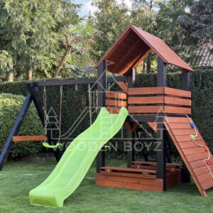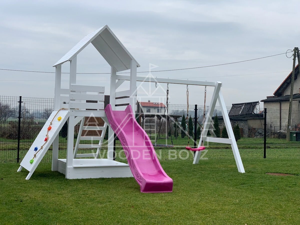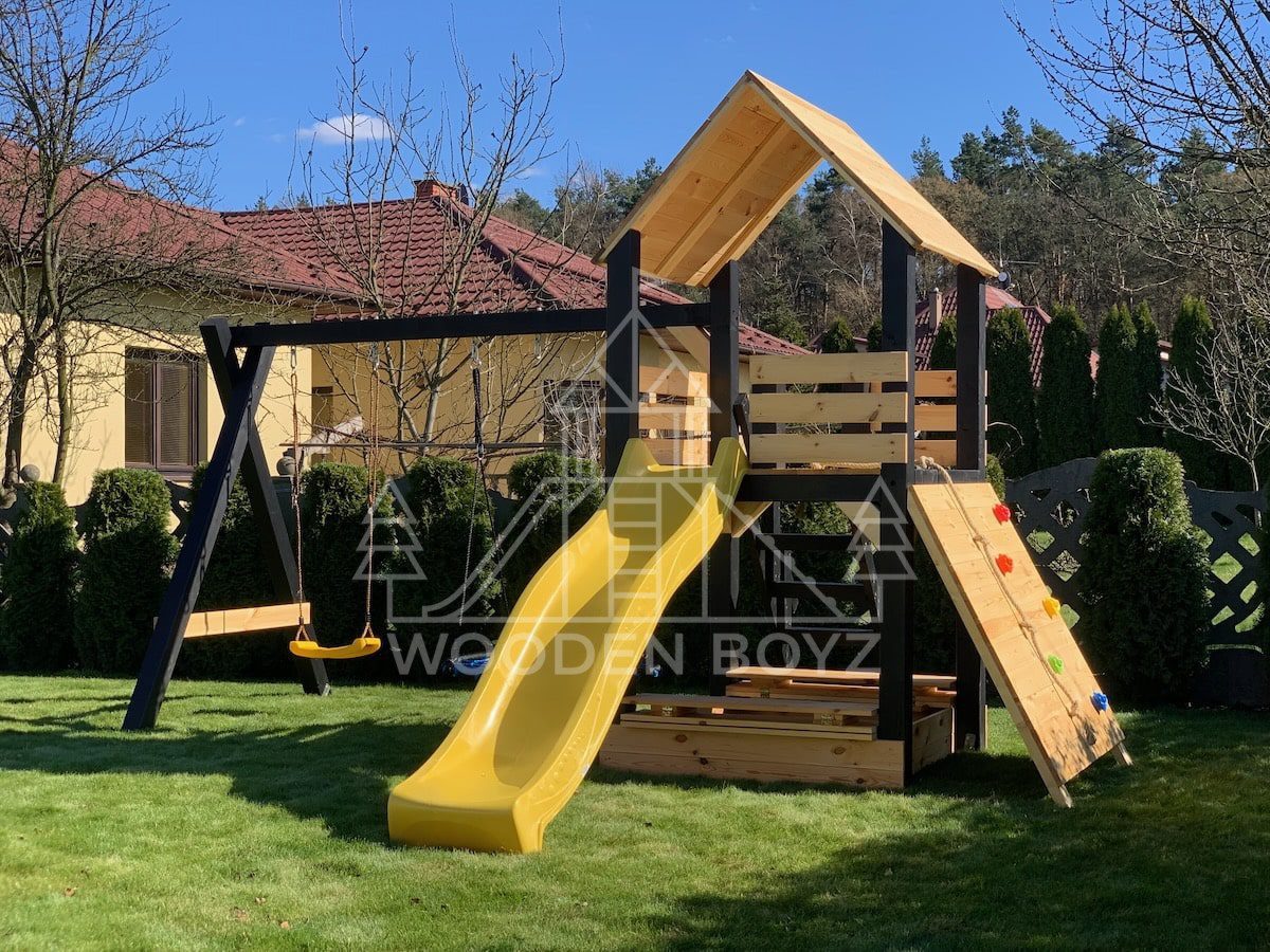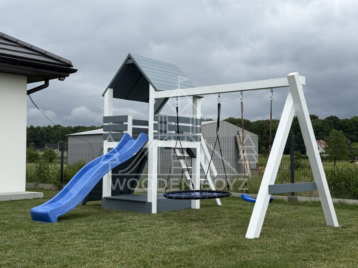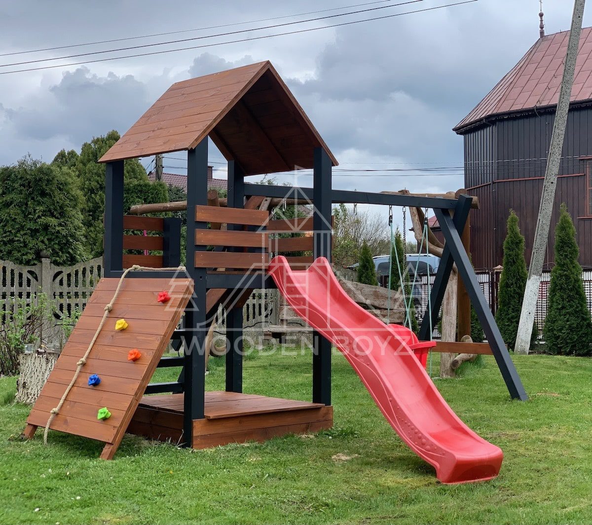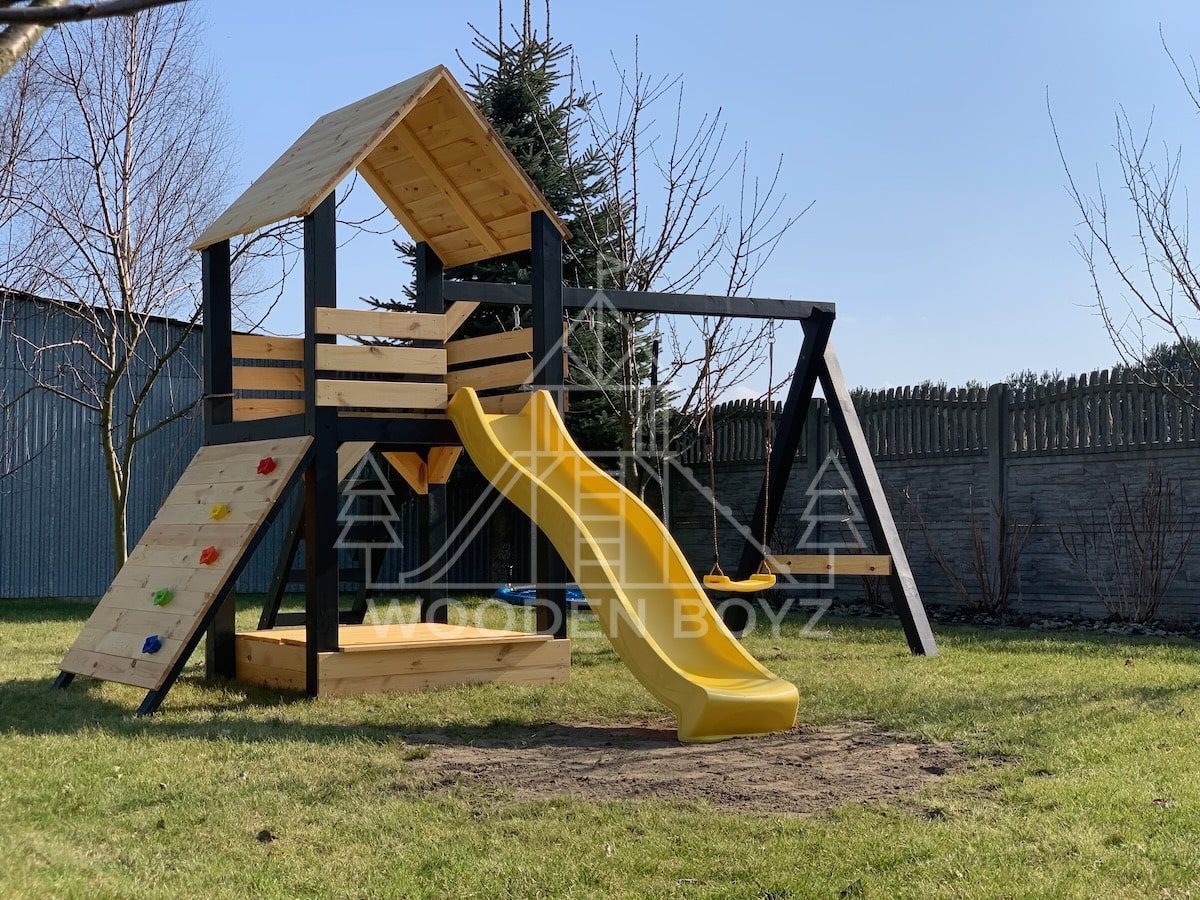 | Wyposażenie standardowe | Otwarta piaskownica Wieża ze ścianką wspinaczkową – dwie możliwości wejścia: po linie i po uchwytach wspinaczkowych Schody Dwie huśtawki – do wyboru kubełek dla najmłodszych lub plastikowa deseczka Zjeżdżalnia o długości 2,5m z możliwością podłączenia wody Impregnaty i akcesoria – szeroka paleta kolorów do wyboru |