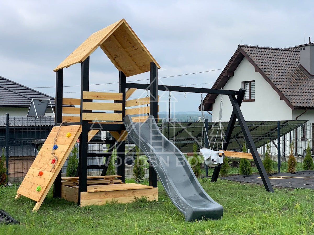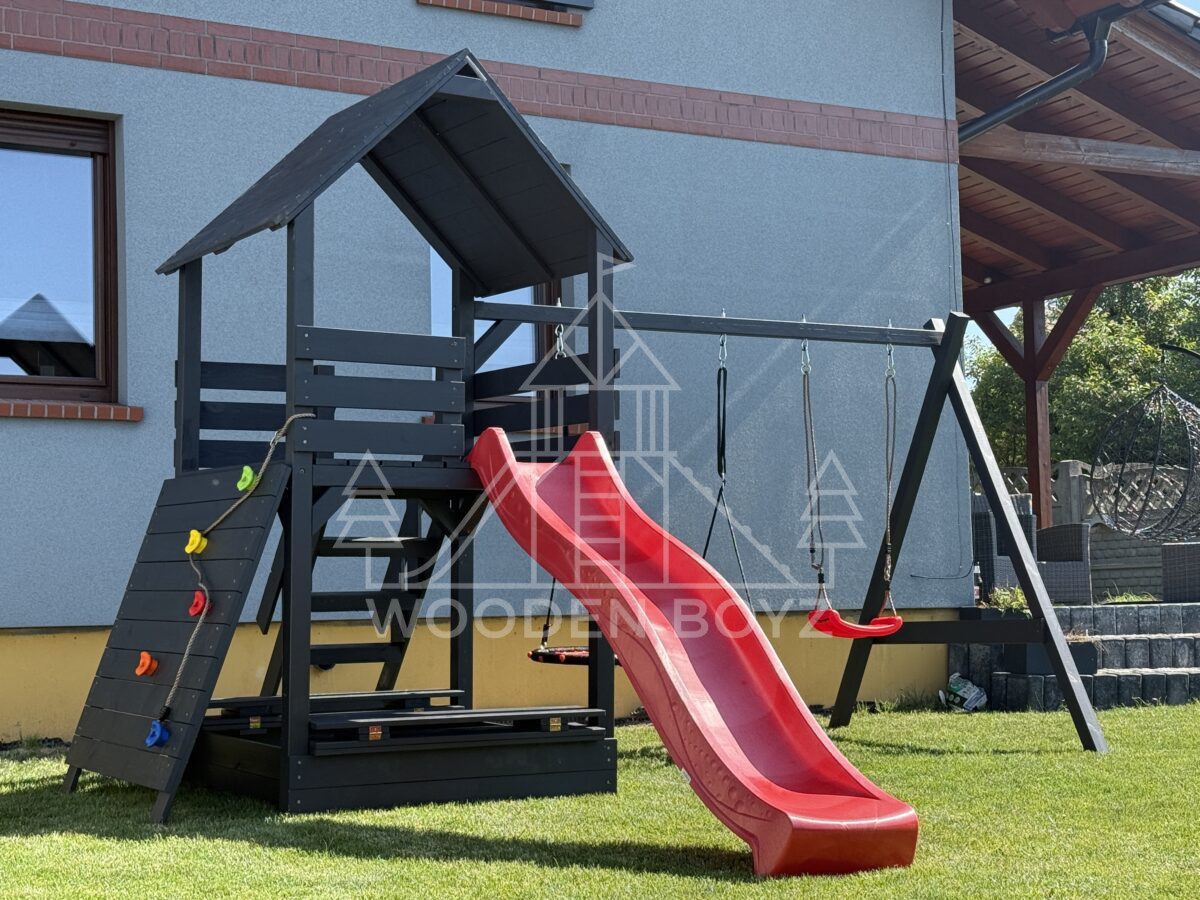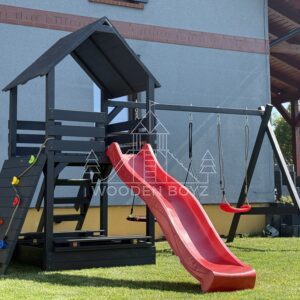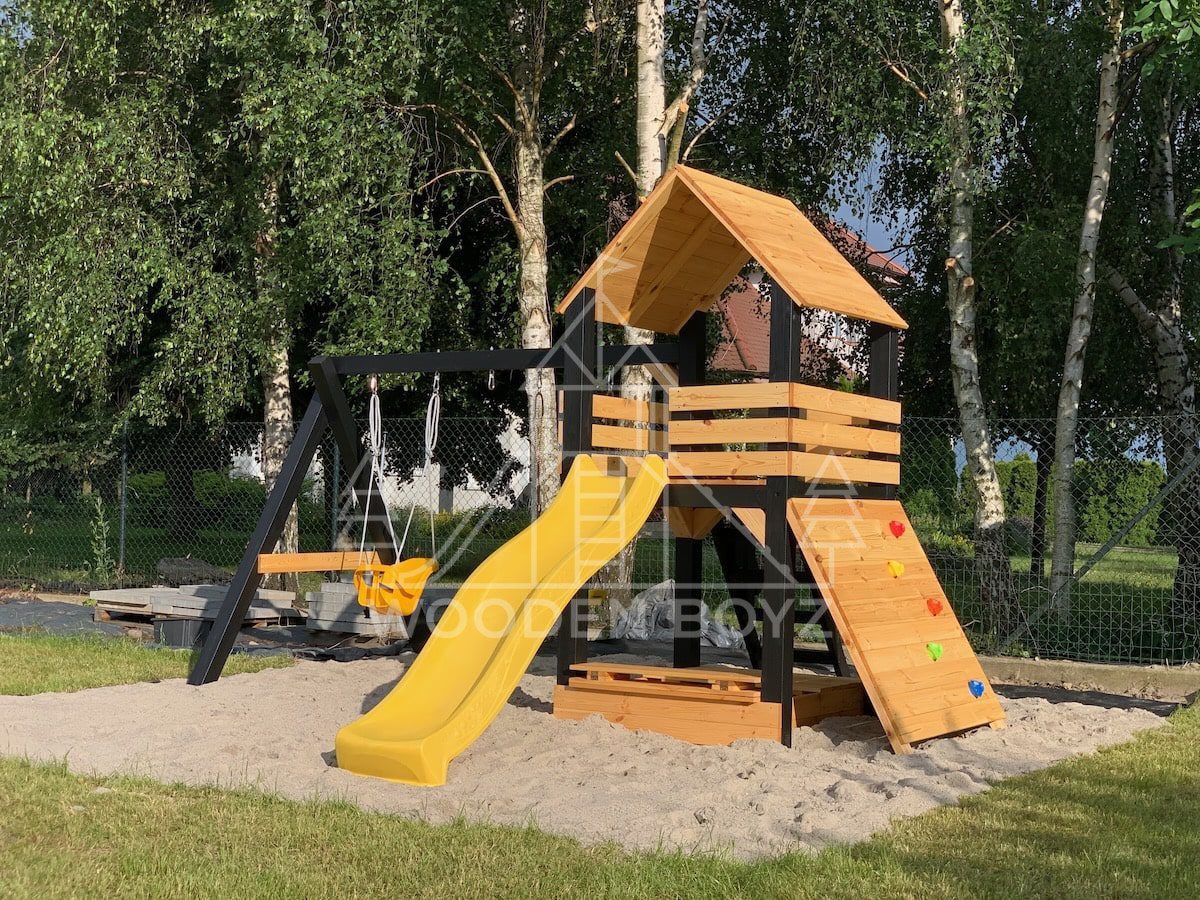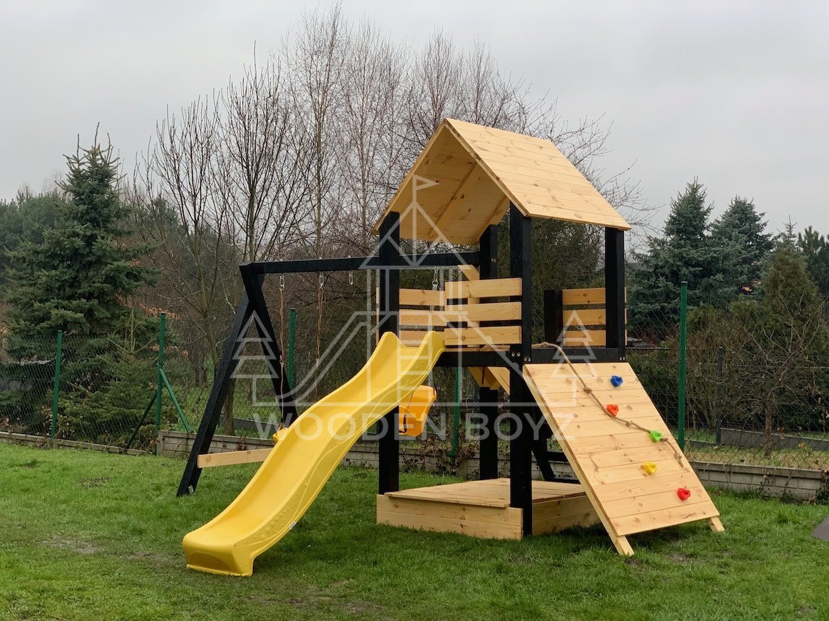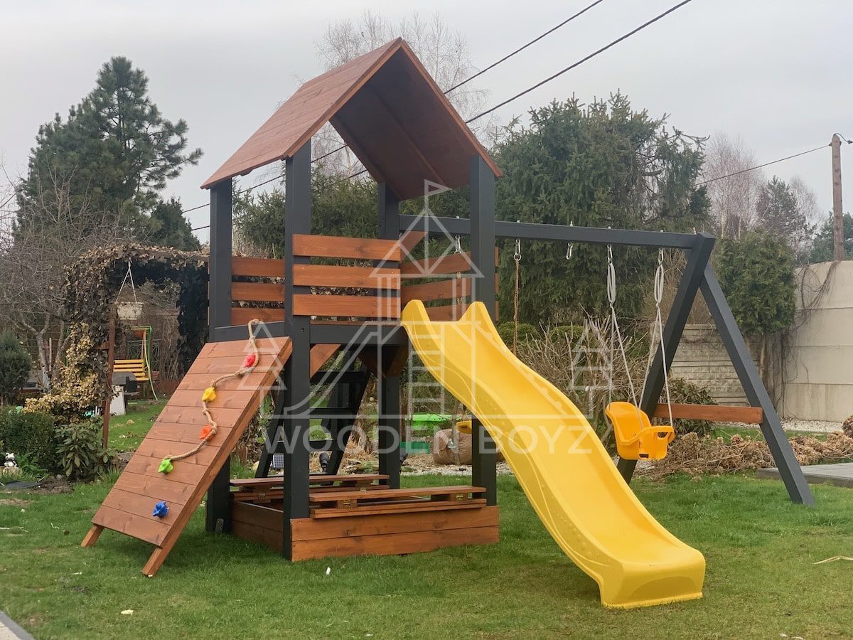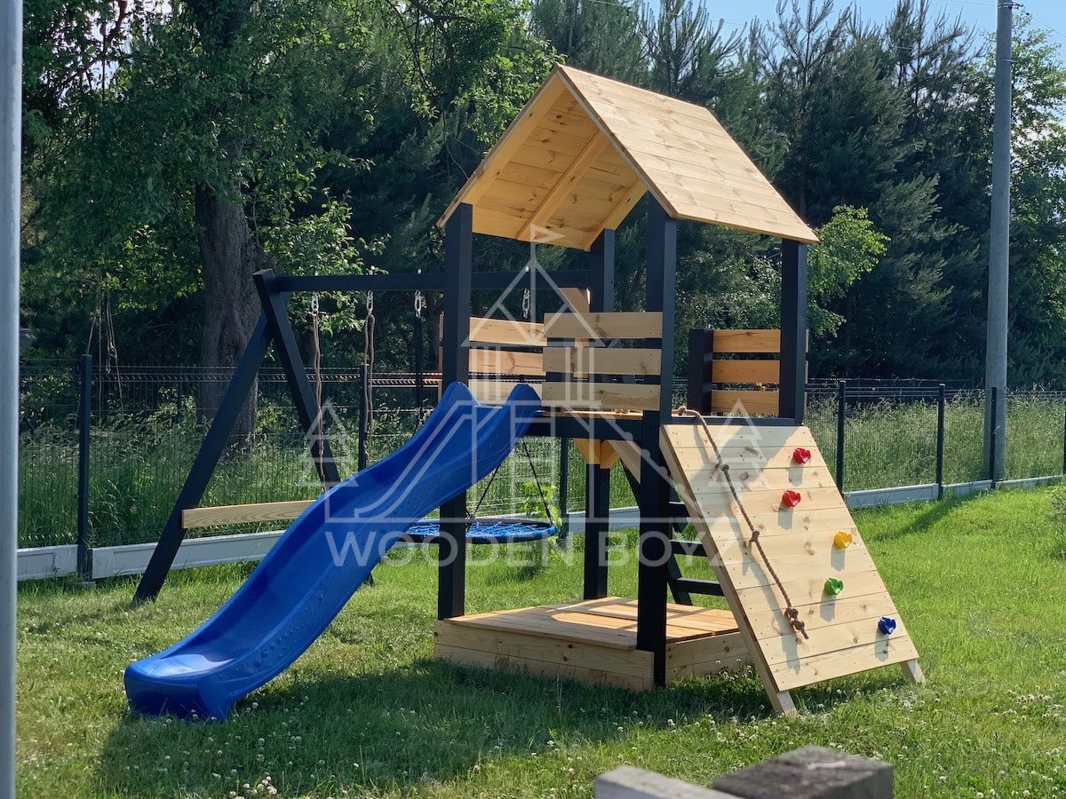 | Wyposażenie standardowe | Otwarta piaskownica Wieża ze ścianką wspinaczkową – dwie możliwości wejścia: po linie i po uchwytach wspinaczkowych Schody Dwie huśtawki – do wyboru kubełek dla najmłodszych lub plastikowa deseczka Zjeżdżalnia o długości 2,5m z możliwością podłączenia wody Impregnaty i akcesoria – szeroka paleta kolorów do wyboru |