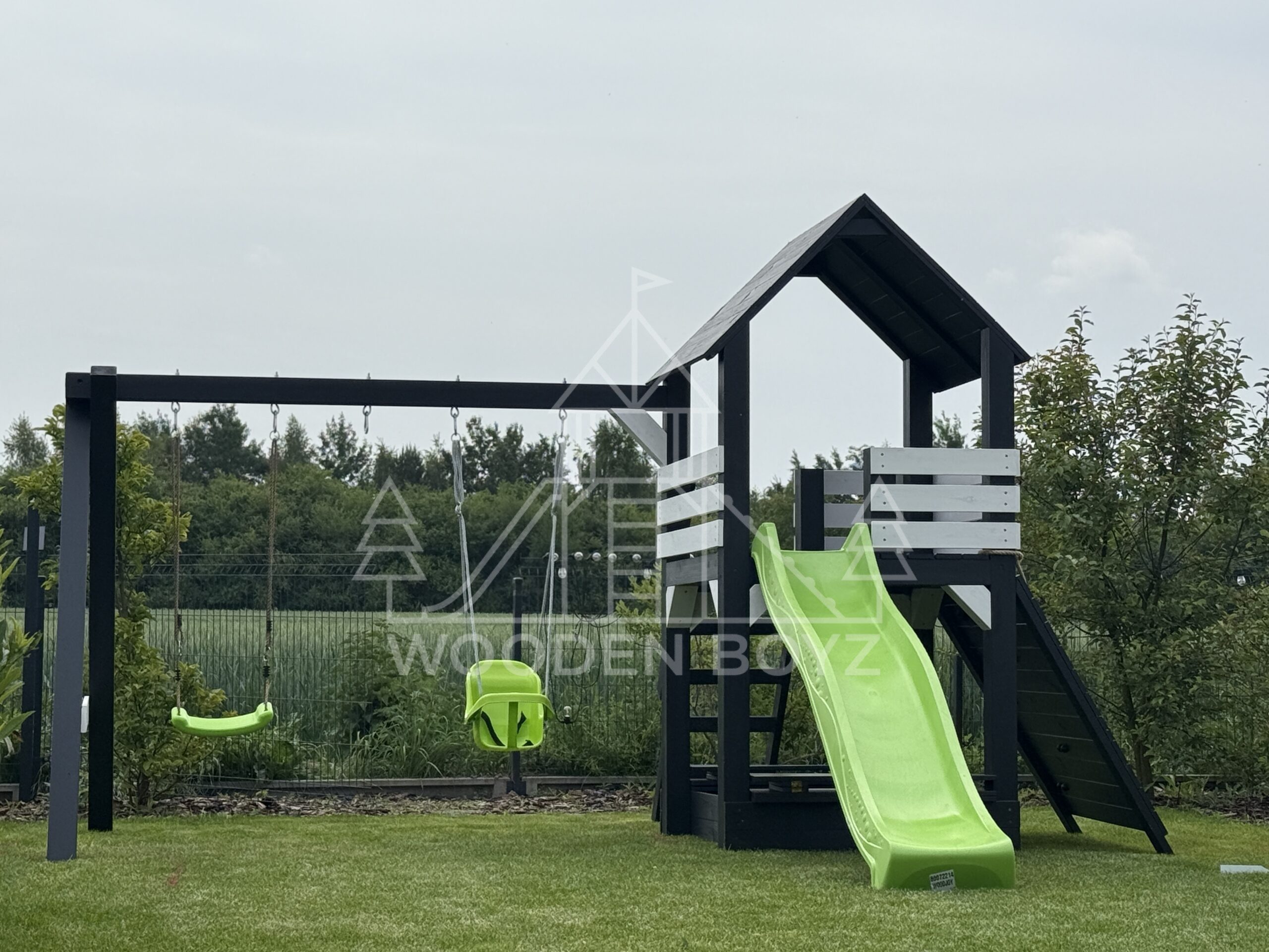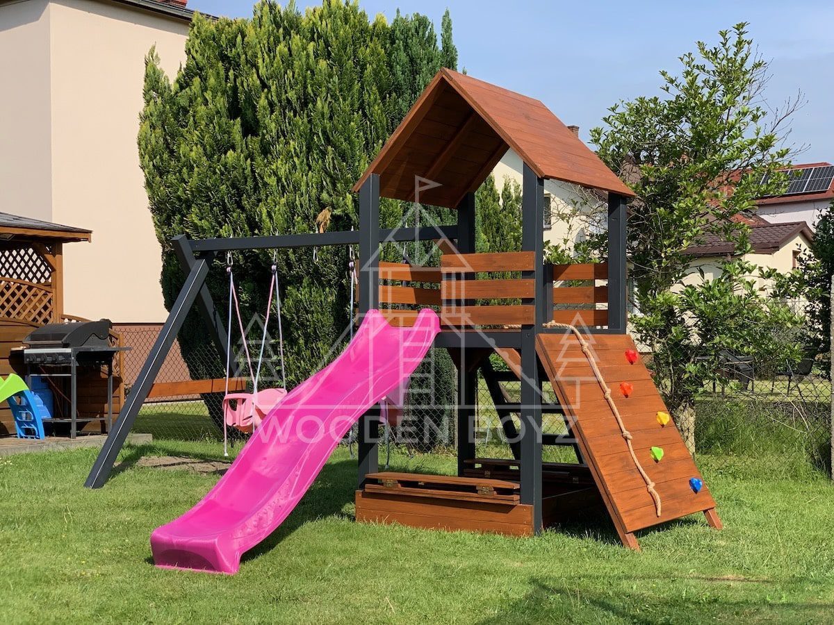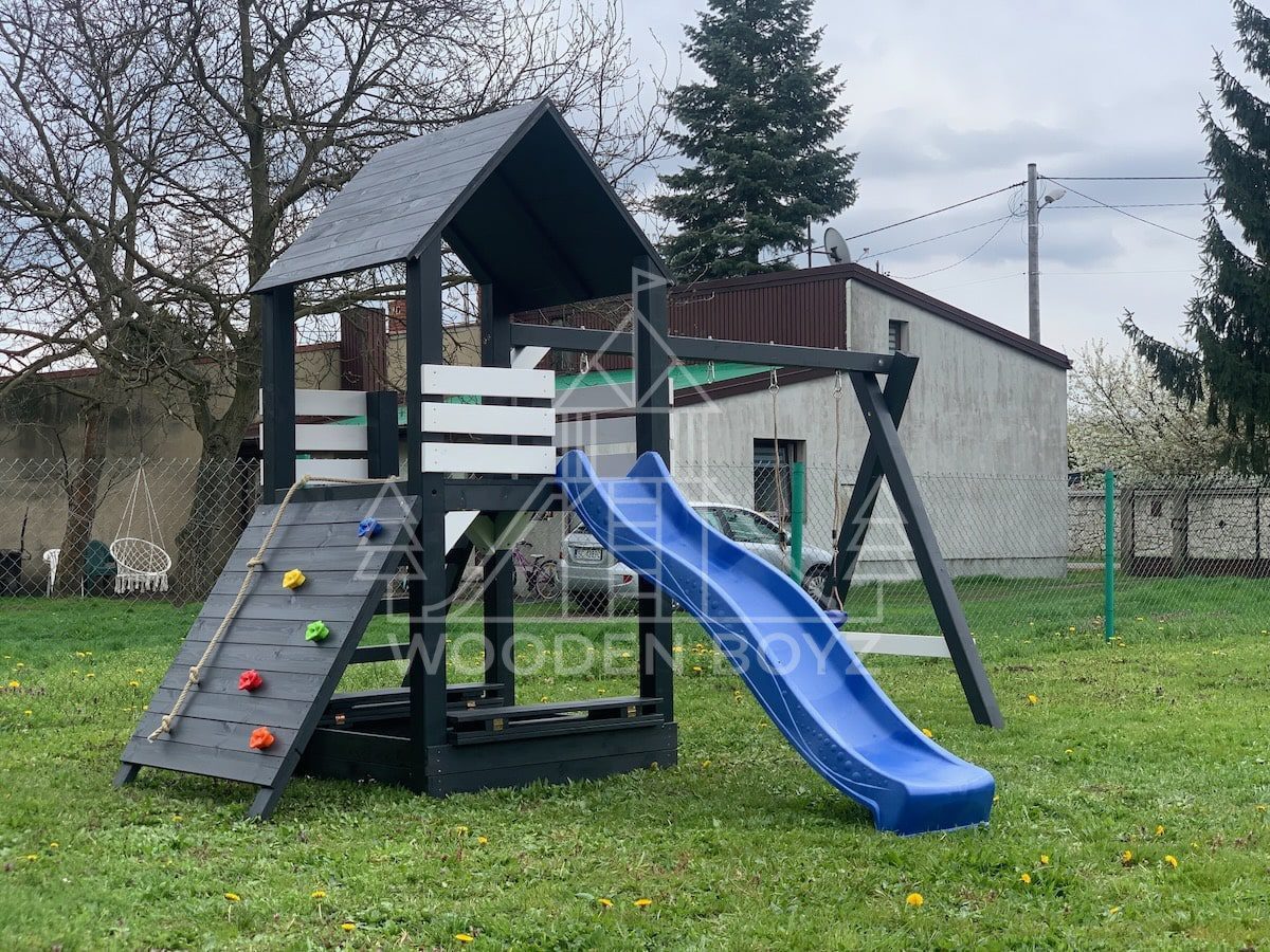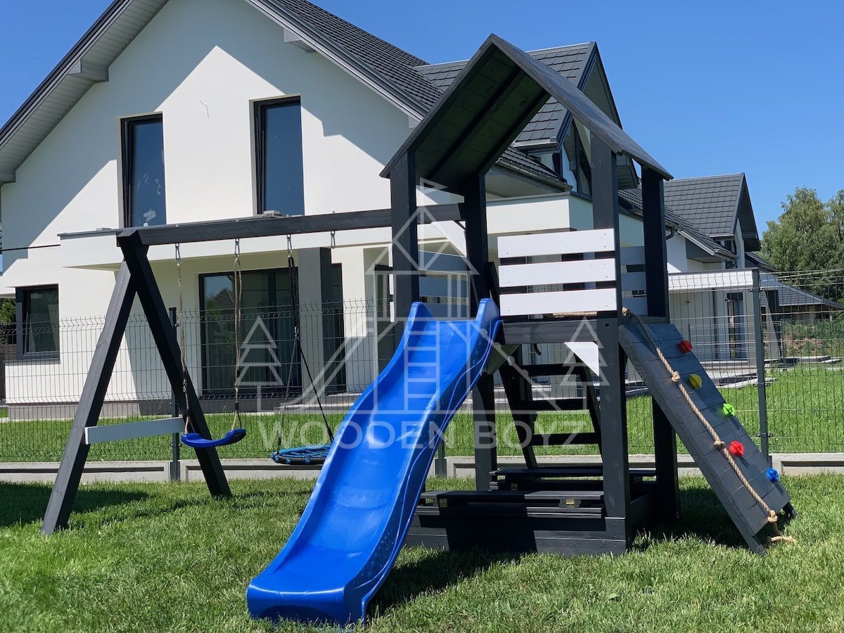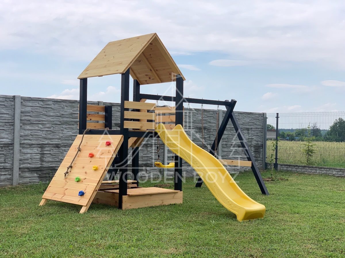 | Wyposażenie standardowe | Otwarta piaskownica Wieża ze ścianką wspinaczkową – dwie możliwości wejścia: po linie i po uchwytach wspinaczkowych Schody Dwie huśtawki – do wyboru kubełek dla najmłodszych lub plastikowa deseczka Zjeżdżalnia o długości 2,5m z możliwością podłączenia wody Impregnaty i akcesoria – szeroka paleta kolorów do wyboru |