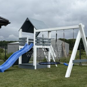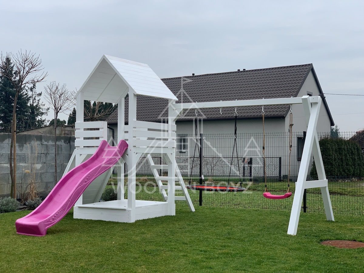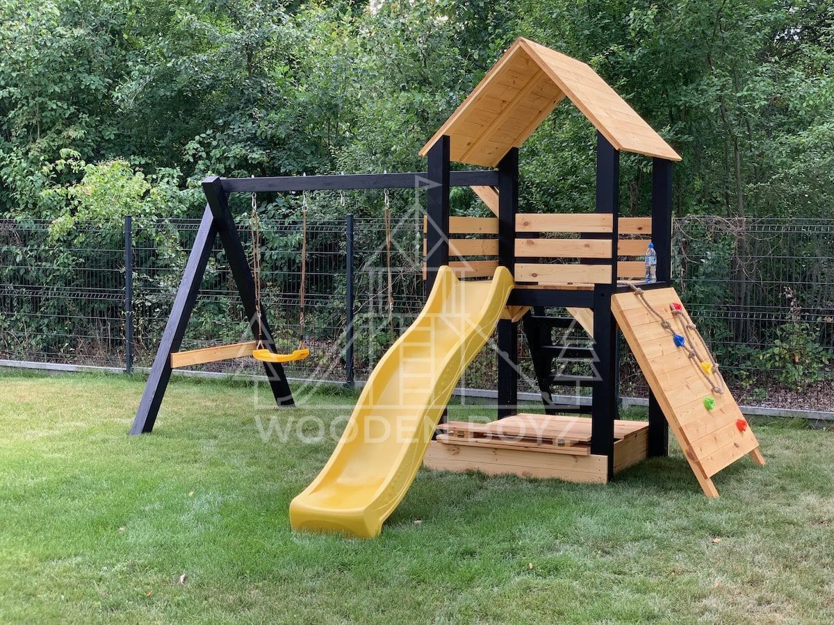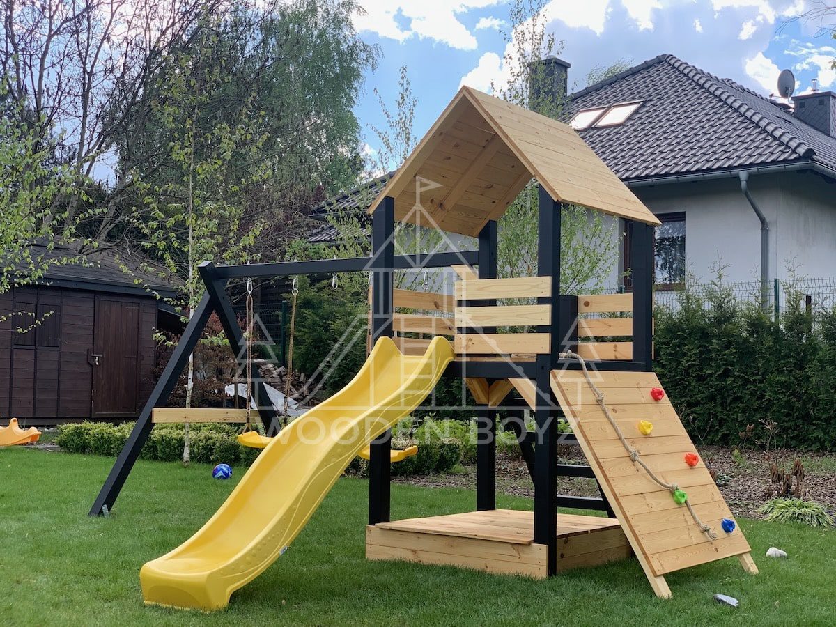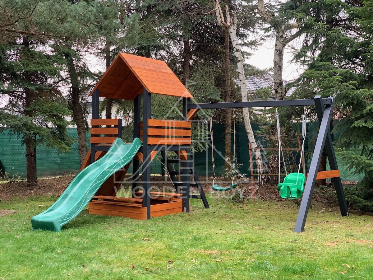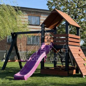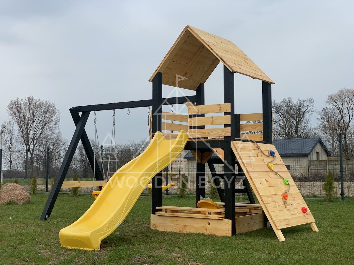 | Wyposażenie standardowe | Otwarta piaskownica Wieża ze ścianką wspinaczkową – dwie możliwości wejścia: po linie i po uchwytach wspinaczkowych Schody Dwie huśtawki – do wyboru kubełek dla najmłodszych lub plastikowa deseczka Zjeżdżalnia o długości 2,5m z możliwością podłączenia wody Impregnaty i akcesoria – szeroka paleta kolorów do wyboru |
