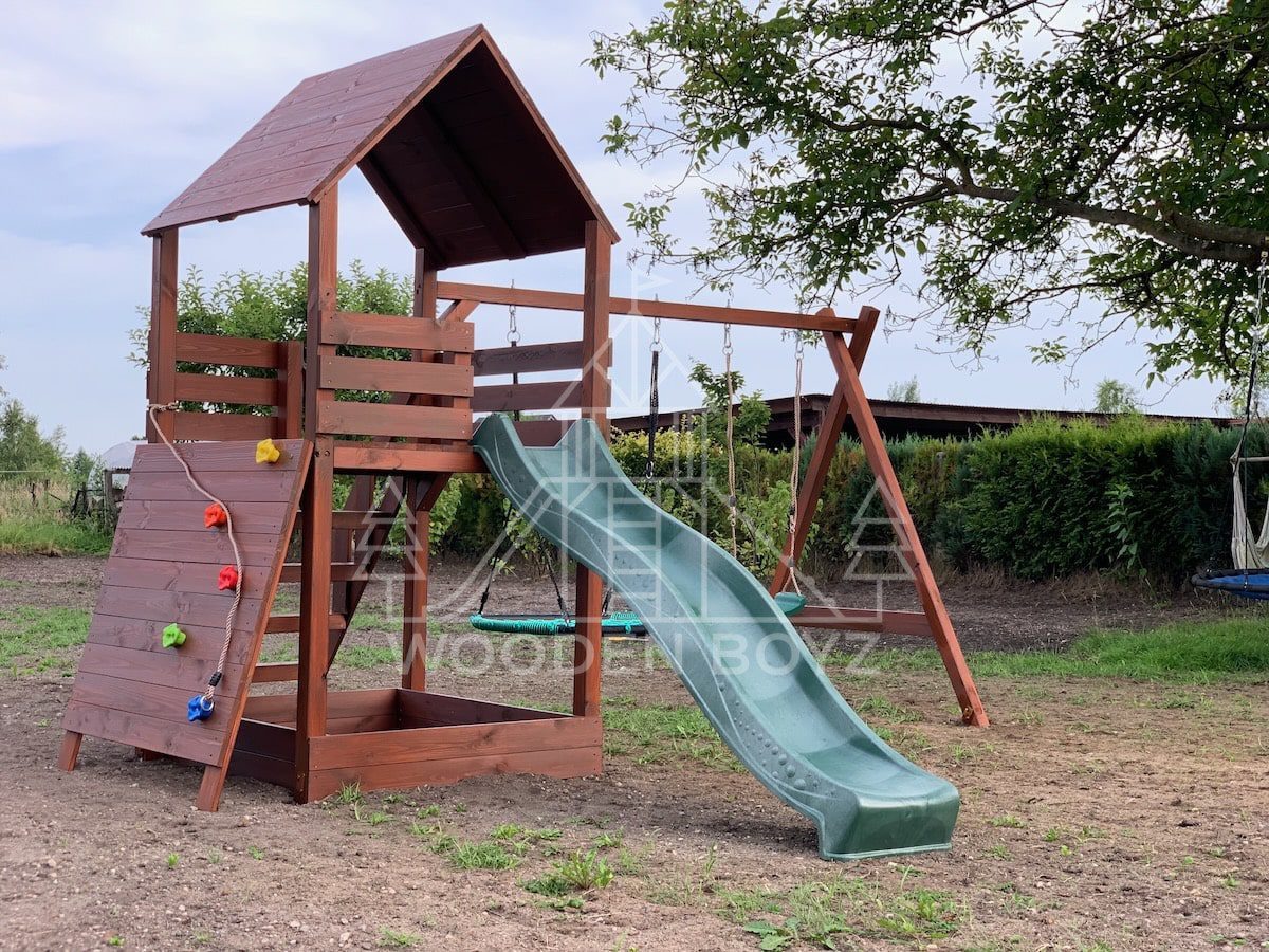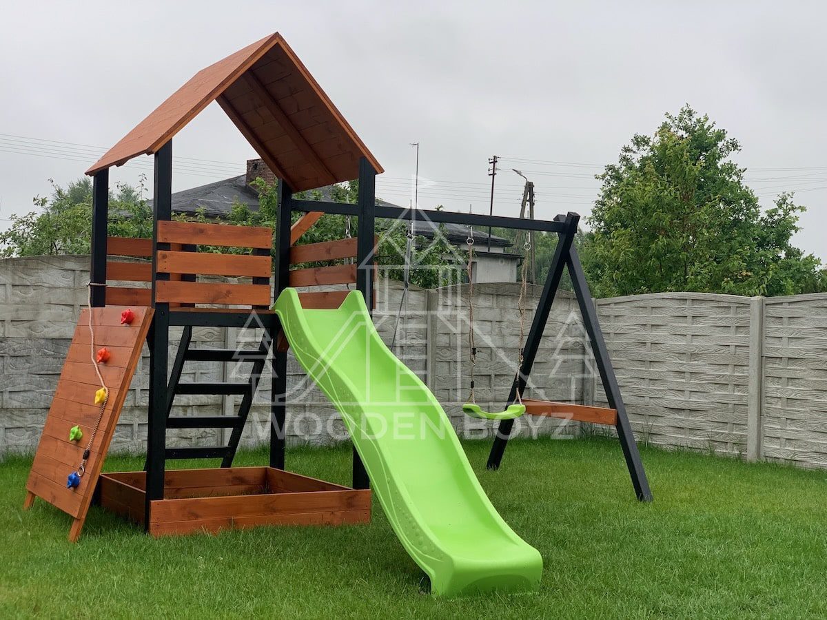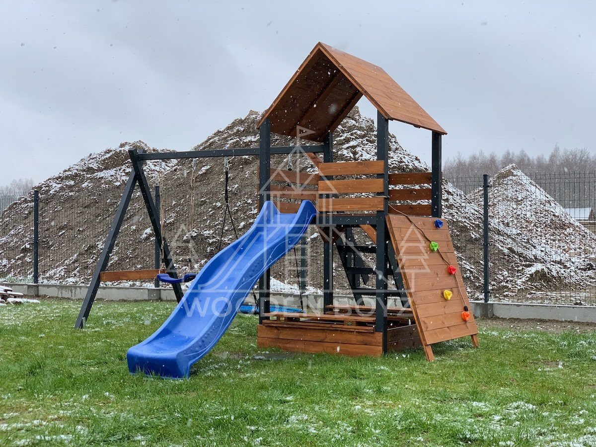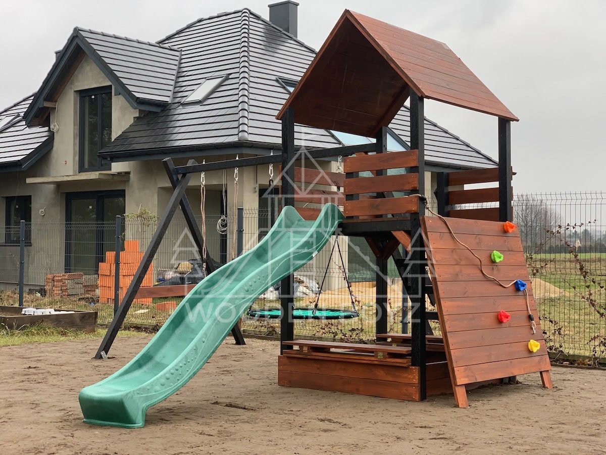 | Wyposażenie standardowe | Otwarta piaskownica Schody Wieża ze ścianką wspinaczkową Dwie huśtawki – do wyboru kubełek dla najmłodszych lub plastikowa deseczka Zjeżdżalnia o długości 2,5m z możliwością podłączenia wody Impregnaty i akcesoria – szeroka paleta kolorów do wyboru |