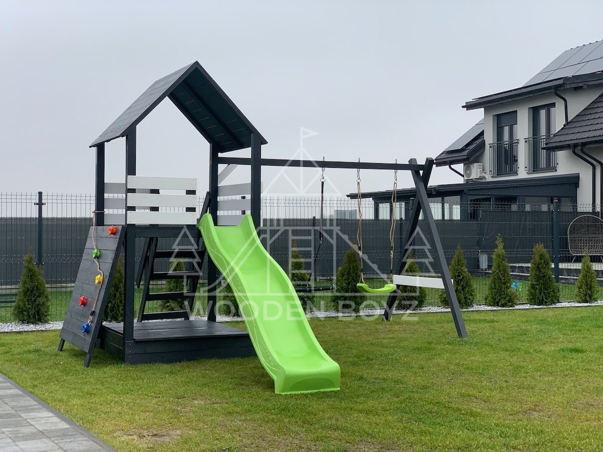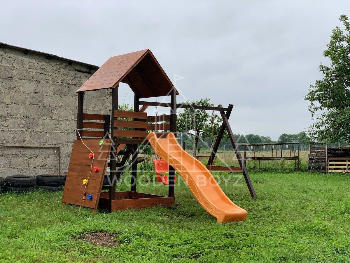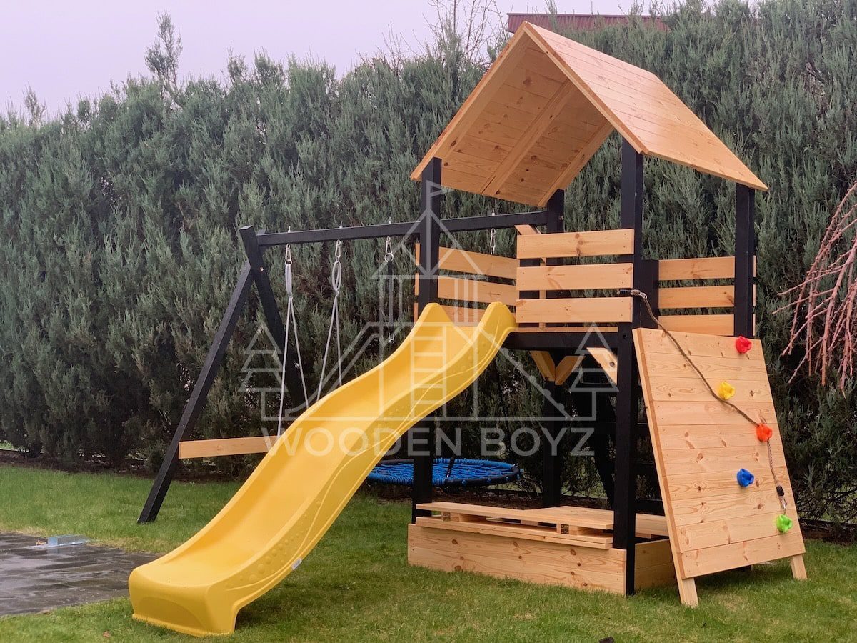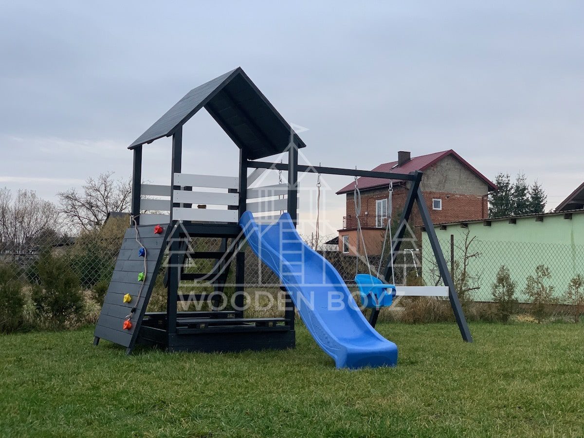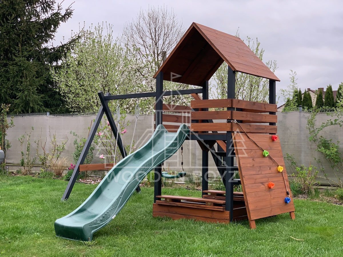 | Wyposażenie standardowe | Otwarta piaskownica Schody Wieża ze ścianką wspinaczkową Dwie huśtawki – do wyboru kubełek dla najmłodszych lub plastikowa deseczka Zjeżdżalnia o długości 2,5m z możliwością podłączenia wody Impregnaty i akcesoria – szeroka paleta kolorów do wyboru |