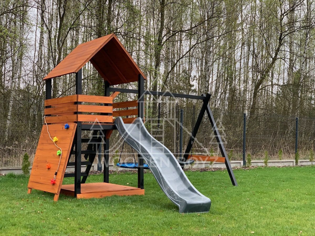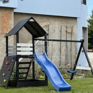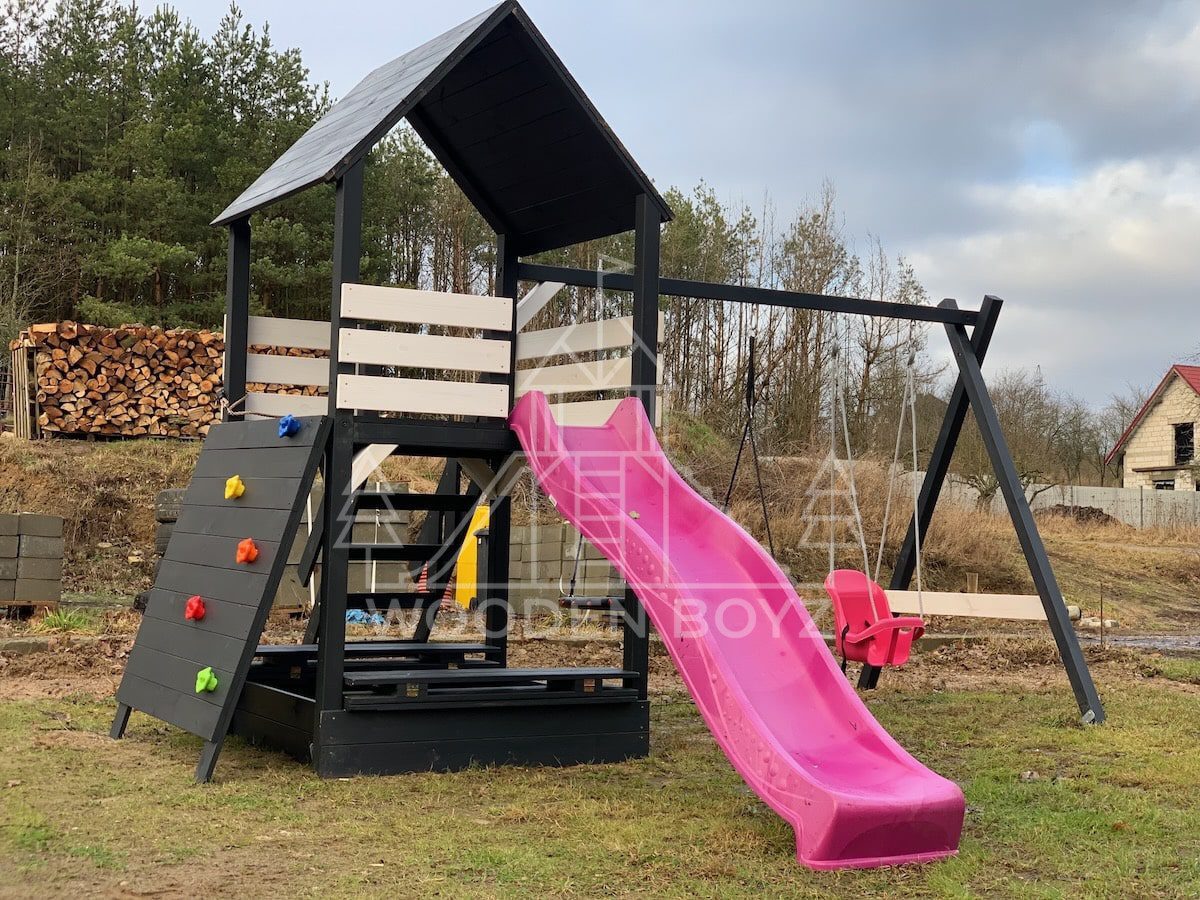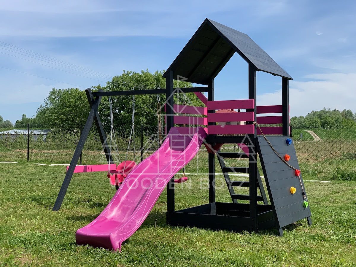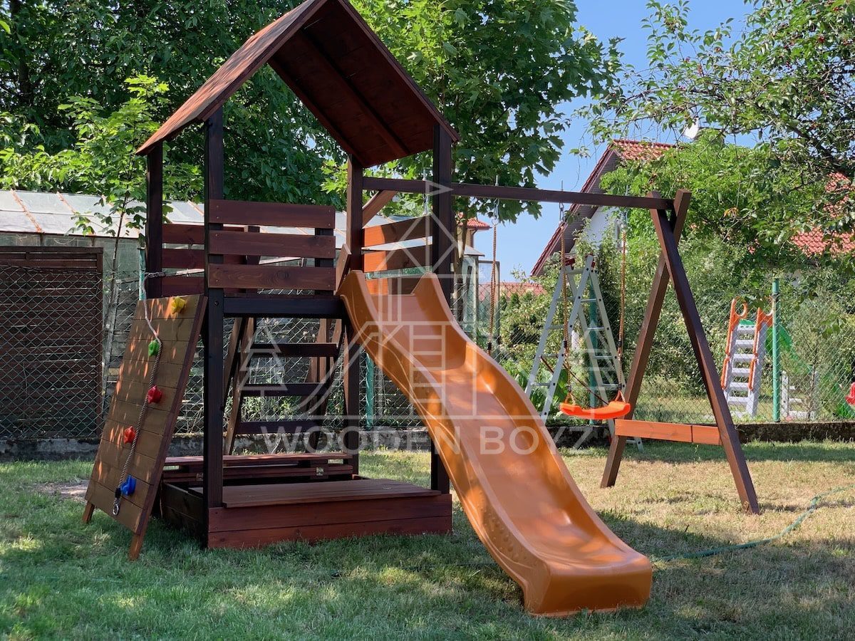 | Wyposażenie standardowe | Otwarta piaskownica Schody Wieża ze ścianką wspinaczkową Dwie huśtawki – do wyboru kubełek dla najmłodszych lub plastikowa deseczka Zjeżdżalnia o długości 2,5m z możliwością podłączenia wody Impregnaty i akcesoria – szeroka paleta kolorów do wyboru |