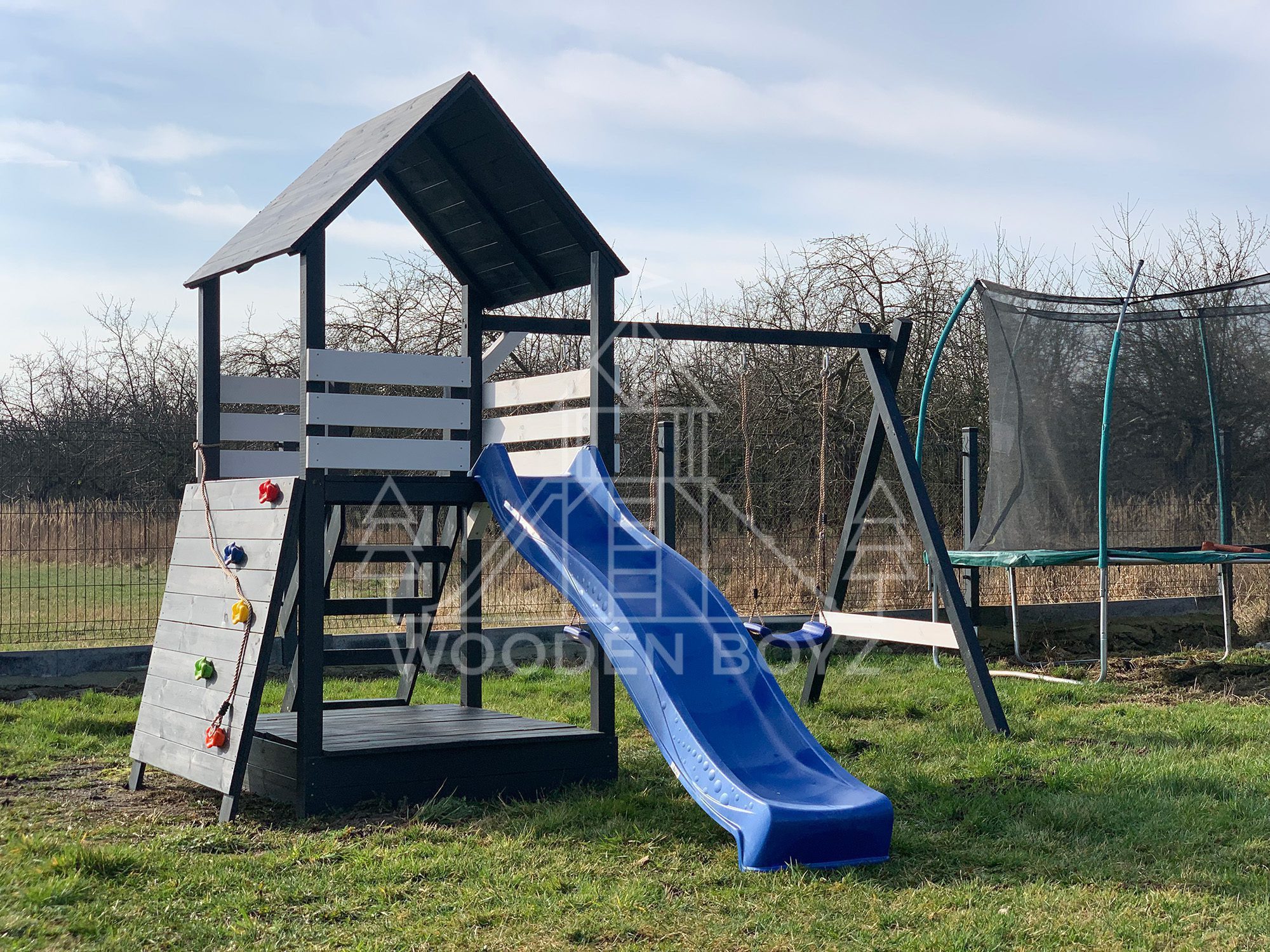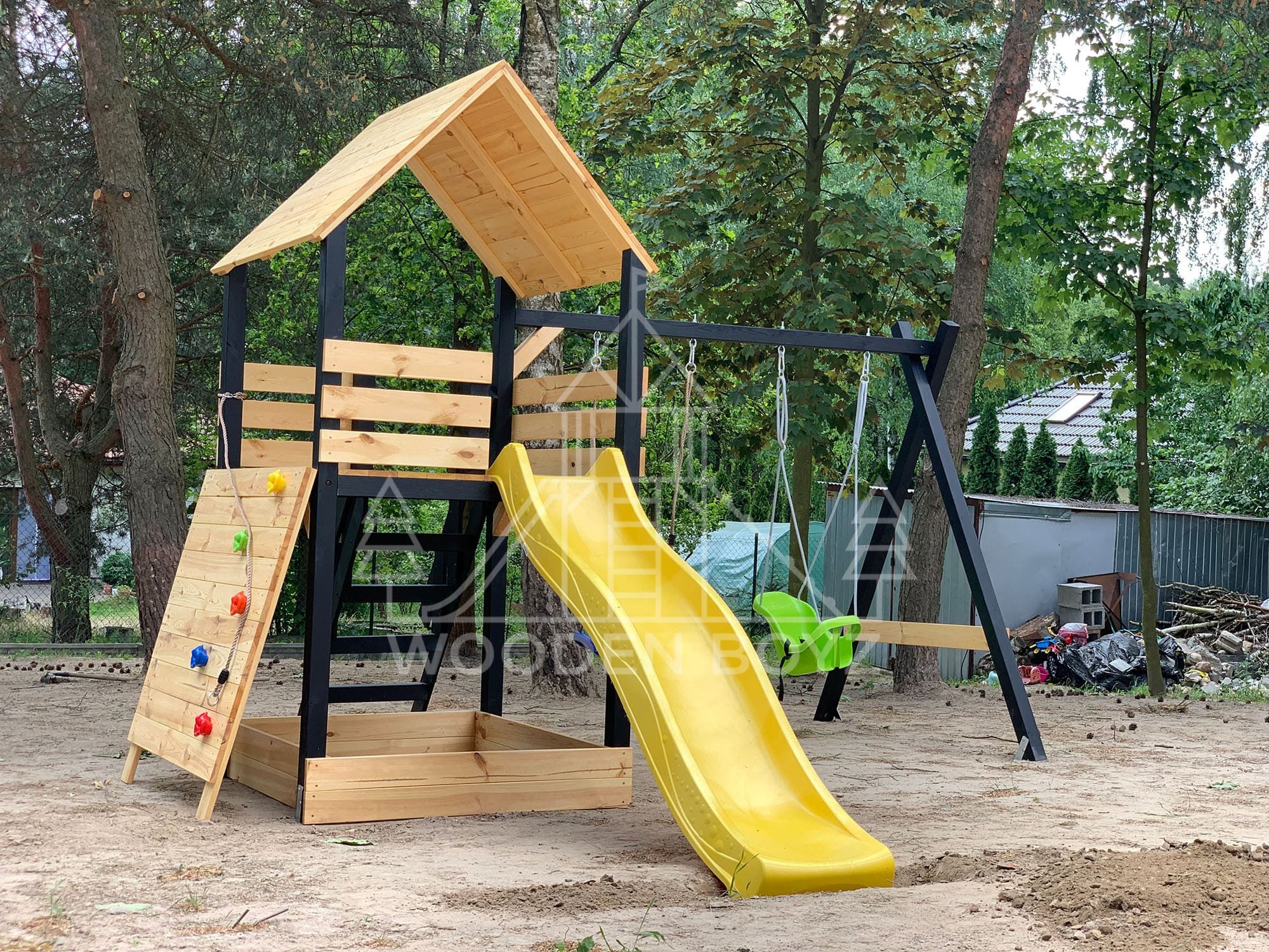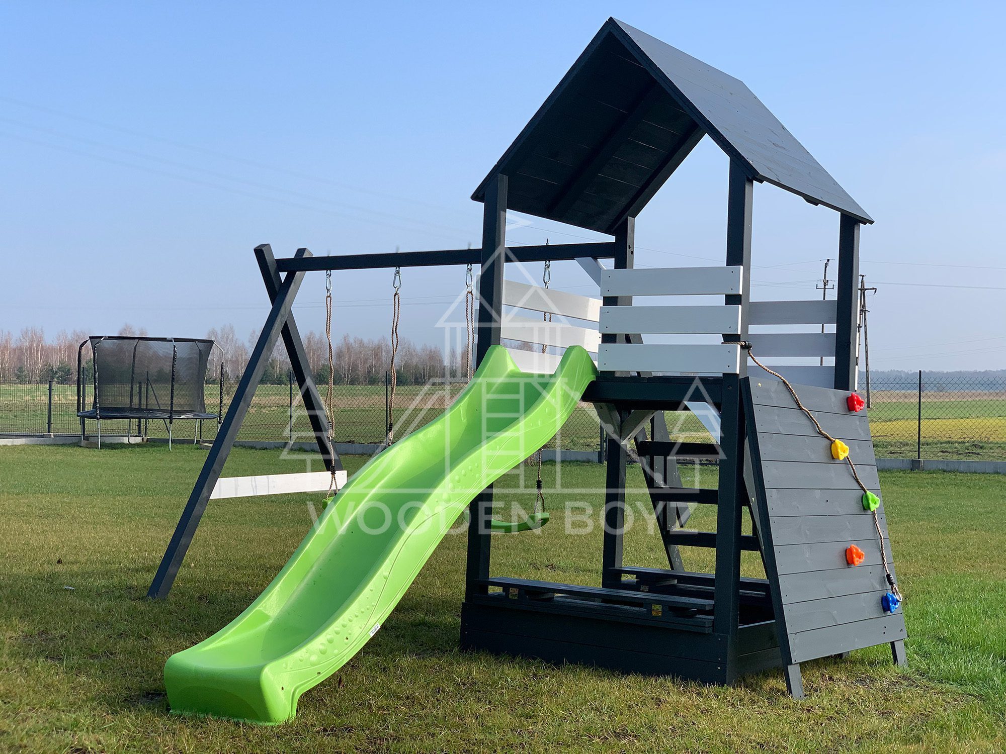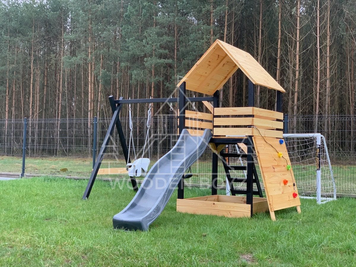 | Wyposażenie standardowe | Otwarta piaskownica Schody Wieża ze ścianką wspinaczkową Dwie huśtawki – do wyboru kubełek dla najmłodszych lub plastikowa deseczka Zjeżdżalnia o długości 2,5m z możliwością podłączenia wody Impregnaty i akcesoria – szeroka paleta kolorów do wyboru |