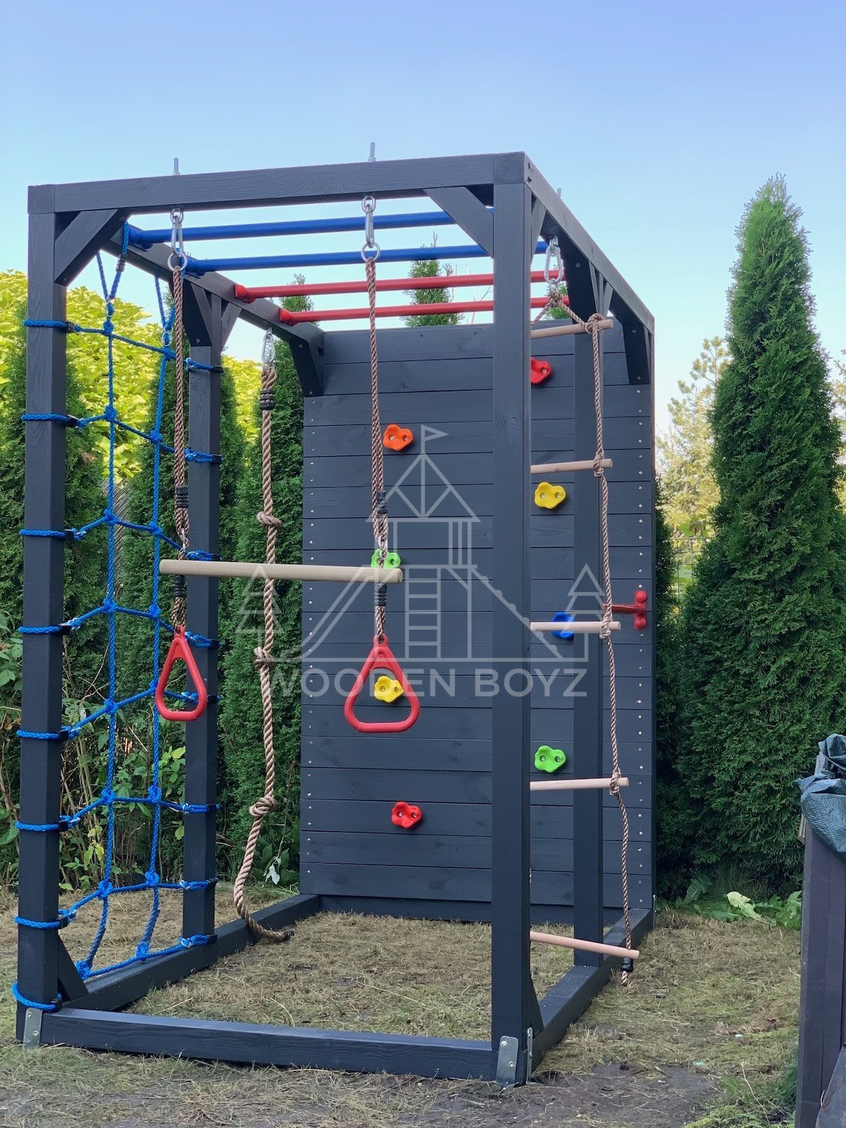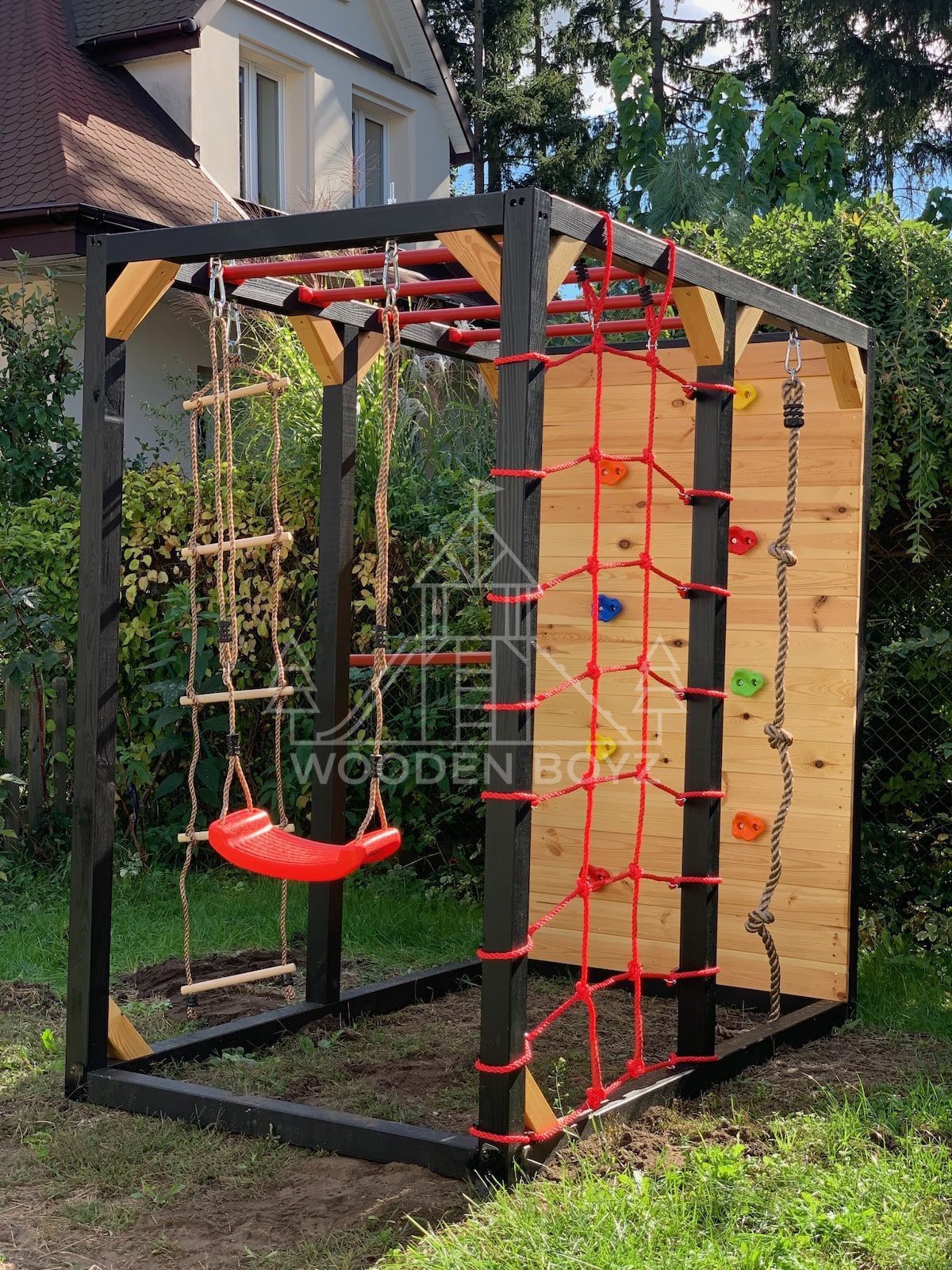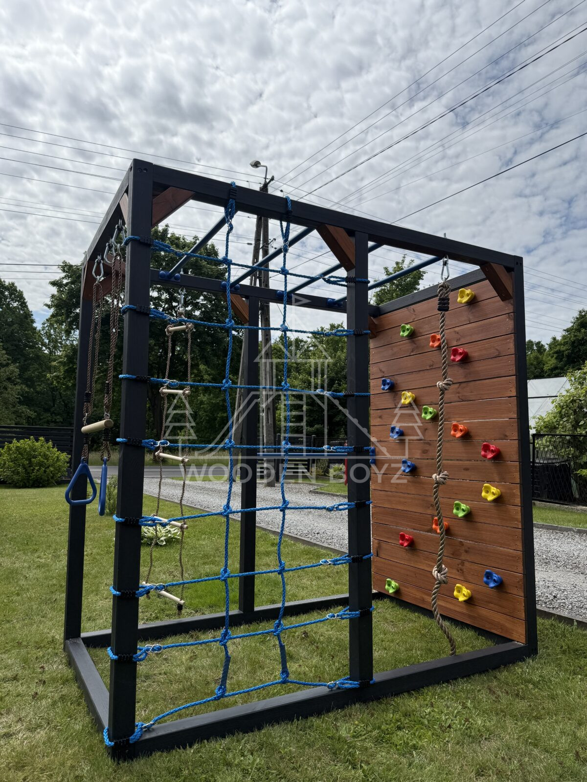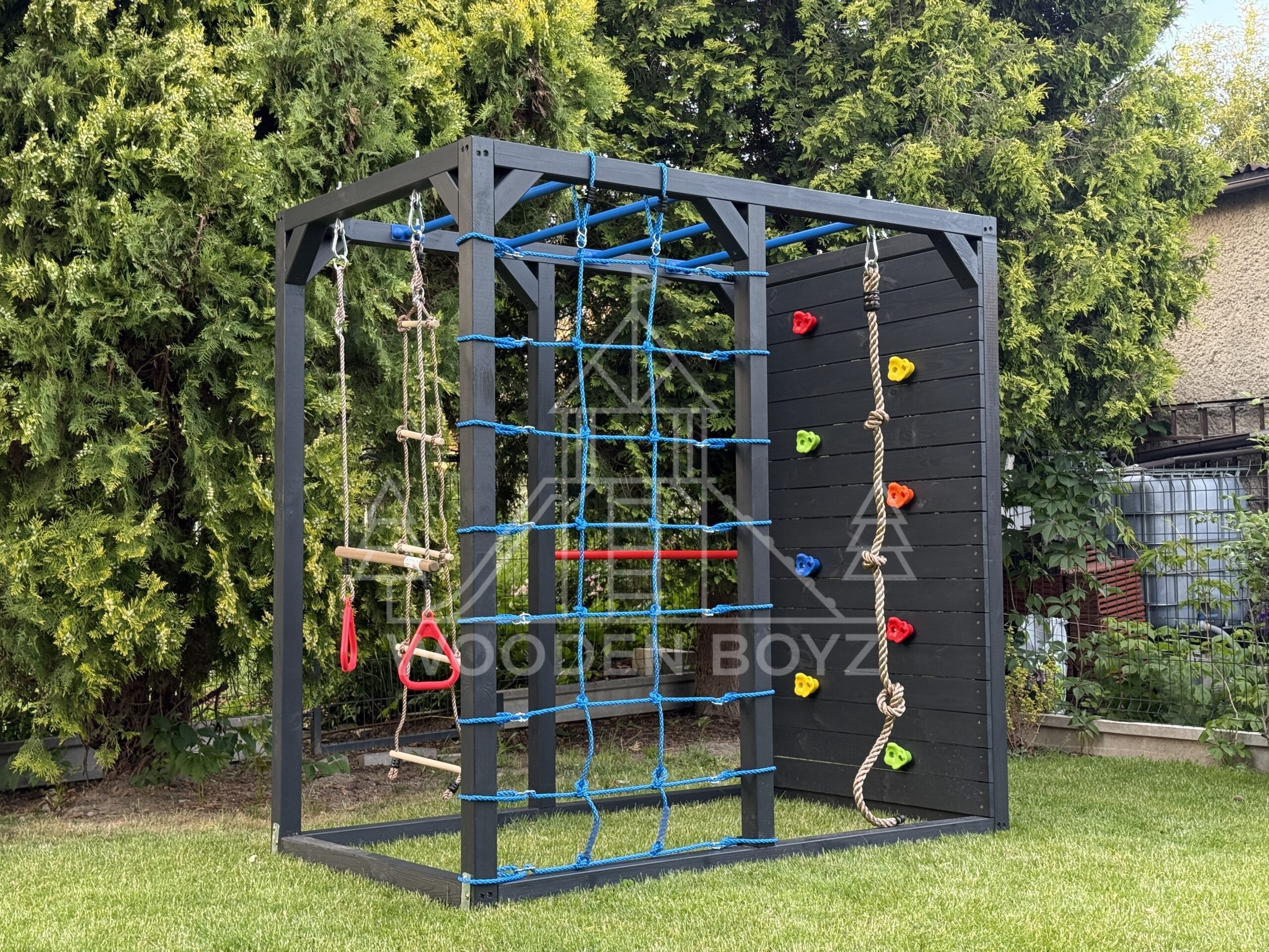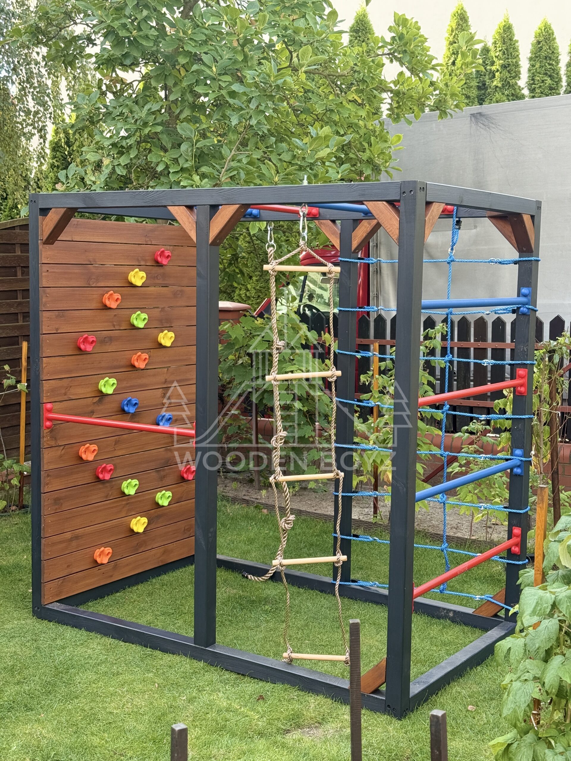 | Wyposażenie standardowe | Drążki w górnej części konstrukcji – idealne do wspinaczki i akrobacji Siatka do wspinaczki Drążek do akrobacji na wysokości 1 metra Wysoka ścianka wspinaczkowa Lina z węzłami Ruchoma drabinka Huśtawka (do wyboru: trapez, orczyk, huśtawka kubełkowa lub deseczka) Zestaw kotw wbijanych w ziemię – dla maksymalnej stabilności Impregnaty i akcesoria – szeroka paleta kolorów do wyboru |